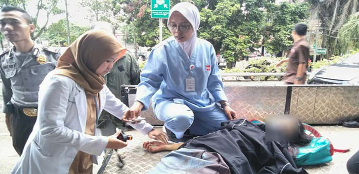 Korban yang terkena tusukan badik di bagian dada mencoba berdiri, lalu tumbang. Korban terlihat seperti menahan sakit, masih terbaring di undakan tangga. Badik masih menancap di dadanya.