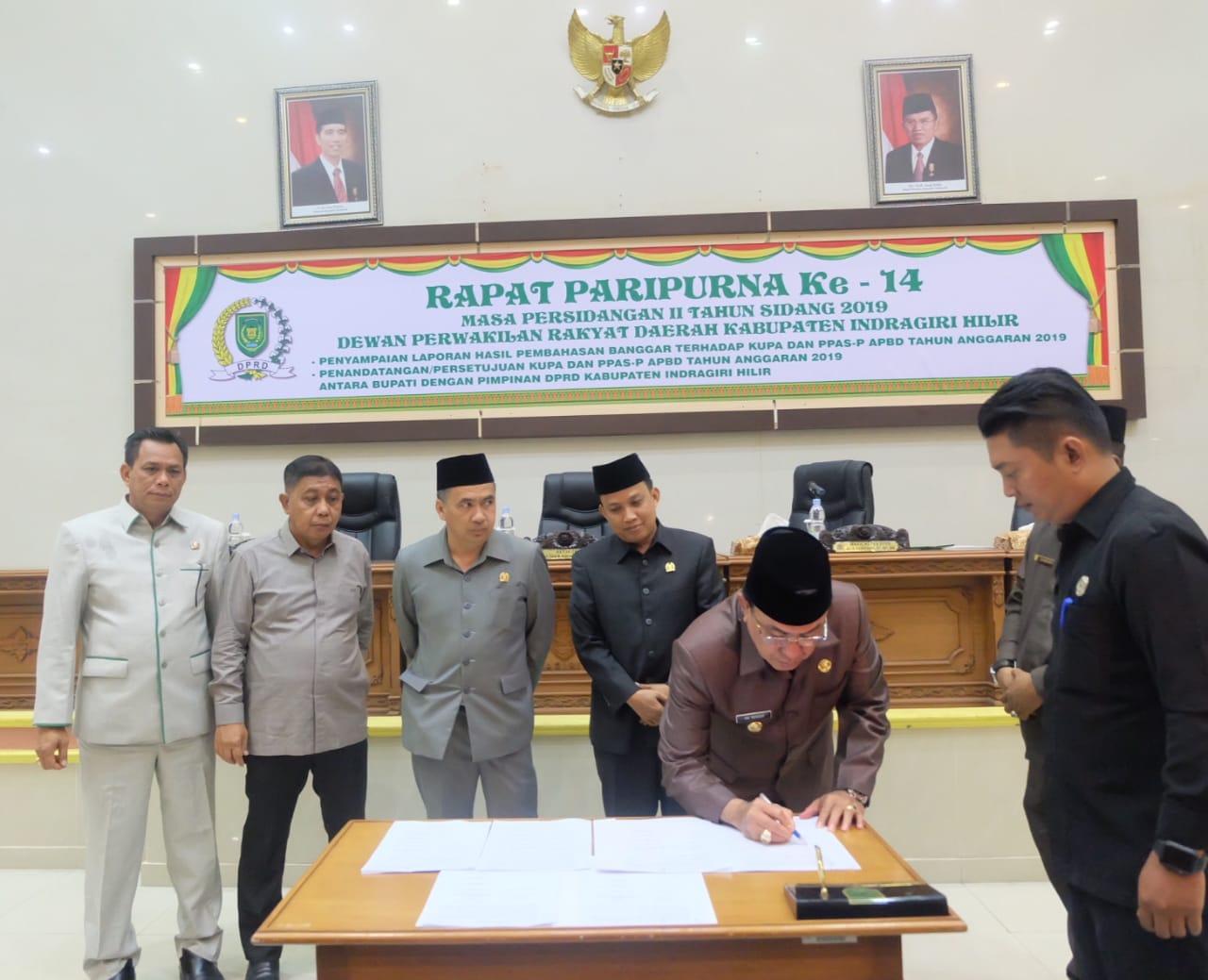 Indragirione.com, - Rapat Paripurna ke 14 masa persidangan II tahun sidang 2019 Dewan Perwakilan Rakyat Daerah (DPRD) Kabupaten Indragiri Hilir dalam penyampaian laporan hasil pembahasan Badan Anggaran terhadap KUPA dan PPAS-P APBD dan Penandatangan/persetujuan KUPA dan PPA-P APBD tahun anggaran 2019 antara Bupati dengan Pimpinan DPRD Kabupaten Indragiri Hilir.