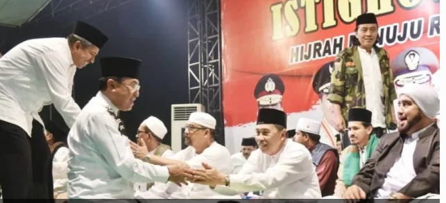 Rombongan Gubernur dan Bupati yang hadir melanjutkan Istighosah Kebangsaan di halaman Mesjid An-Nur Pekanbaru dengan menghadirkan Habib Syech Bin Abdul Qodir Assegaf.