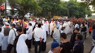 Sebagian besar massa mengenakan baju warna putih serta membawa bendera bertuliskan kalimat tauhid, duduk di jalur lambat Jalan Slamet Riyadi menunggu dimulainya acara.