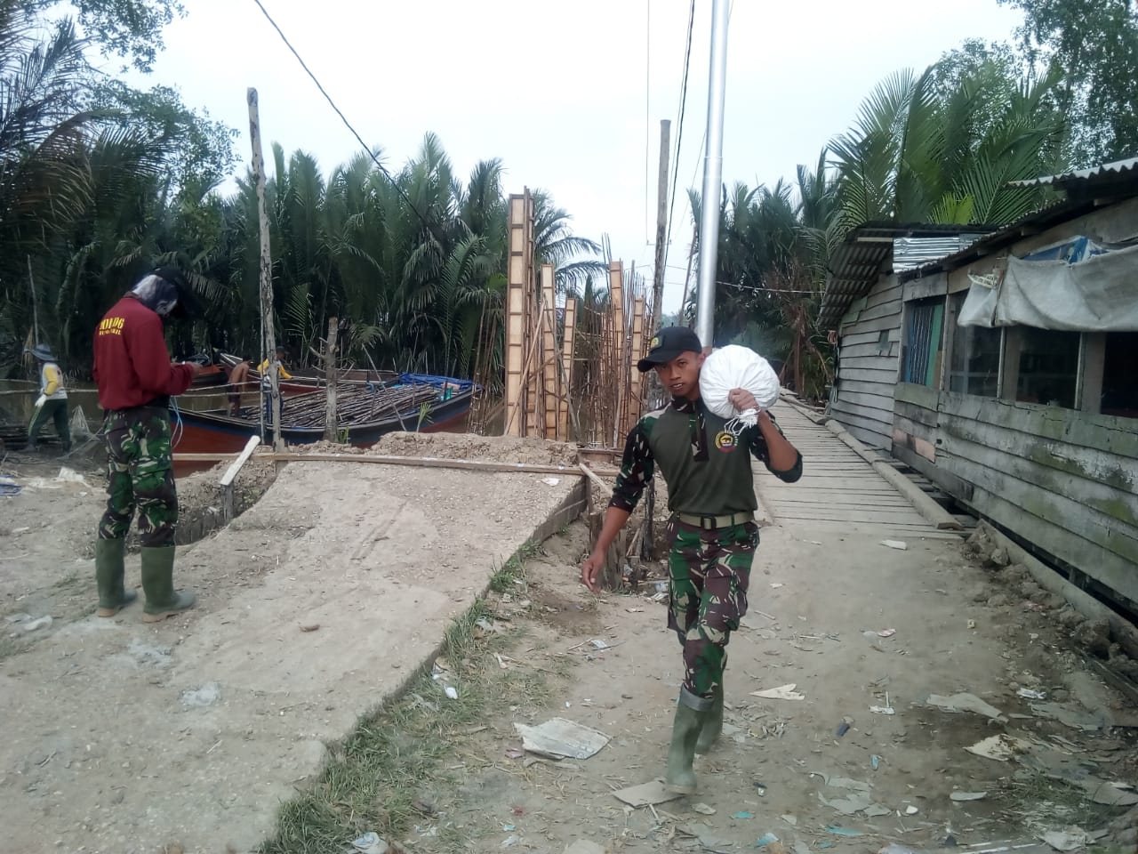 Tidak hanya itu, para satgas bersama masyarakat juga melanglangsir bahan untuk pengecoran tiang dan melengkapi bahan-bahan agar pekerjaan tidak terhenti kekurangan bahan.