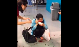 Seorang wanita, terus menawarinya tisu, untuk menghentikan pendarahan akibat goresan senjata tajam. Sebuah luka menganga dari bibir ke atas wajah. Darah juga bercucuran di lantai.