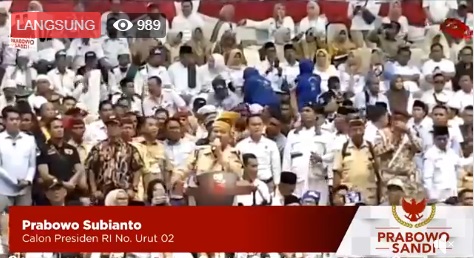 Di sepanjang ruas jalan hingga menuju gerbang Gelanggang Remaja, tampak ribuan massa tak henti menjjali kendaraan yang digunakan Prabowo.