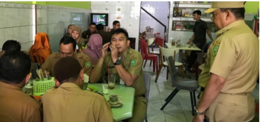Indragirione.com – Usai apel perdana, Senin (10/6) pascalibur lebararan, Wakil Gubernur Riau Edy Nasution langsung melakukan razia terhadap Aparatur Sipil Negara (ASN) yang masih sarapan di kedai kopi.