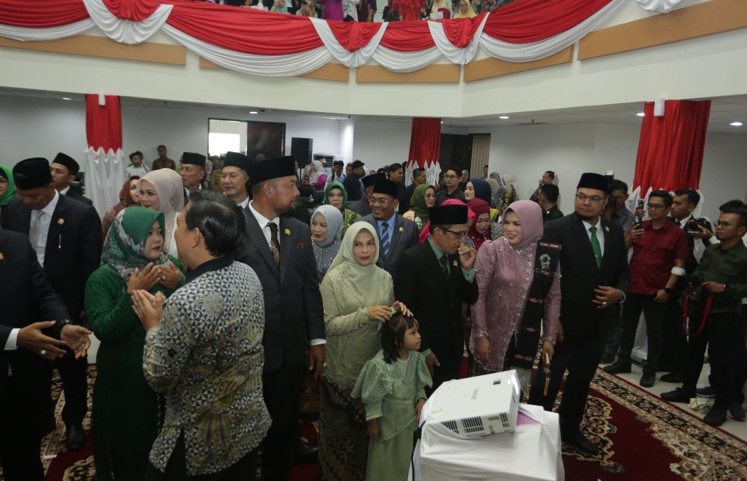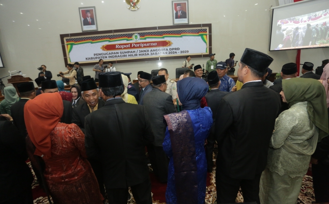 Inhil,_Sebanyak 45 Anggota Dewan Perwakilan Rakyat Daerah (DPRD) Kabupaten Indragiri Hilir (Inhil) diambil sumpah dan janjinya dihadapan masyarakat untuk menjadi Anggota Dewan terpilih masa bakti 2024-2029 di gedung Paripurna DPRD Inhil Jalan Soebrantas, Senin (17/9) Pagi.