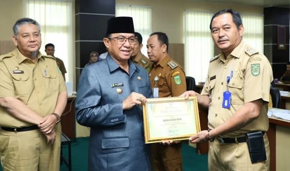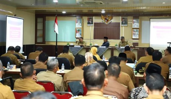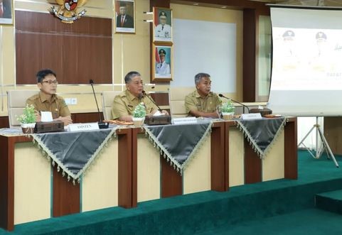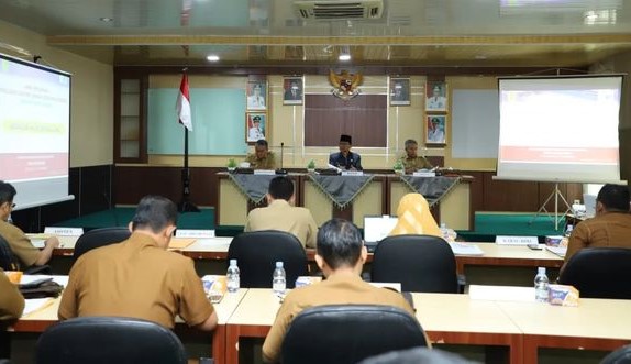 Rapat yang disejalankan dengan penyerahan penghargaan atas upaya percepatan dalam mewujudkan jaminan kesehatan semesta (UHC) di Kab. Inhil bagi kecamatan dengan pencapaian yang melebihi target periode Juni 2023 dihadiri Staf Ahli Bupati dan Asisten serta seluruh Kepala OPD dan Camat di lingkungan Pemkab. Inhil.