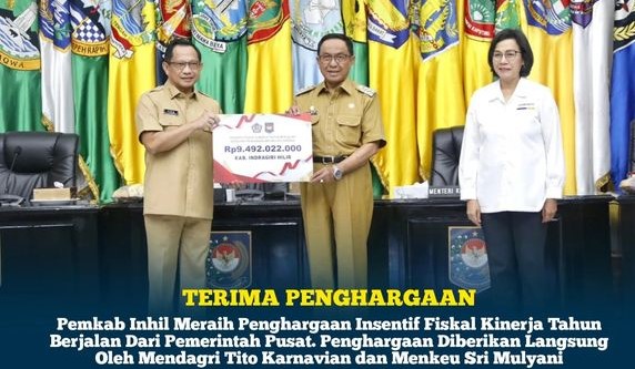 Penghargaan pengendalian Inflasi itu diganjar dengan insentif fiskal senilai 9,492 milyar rupiah untuk inhil diberikan langsung oleh Menteri Dalam Negeri (Mendagri) Tito Karnavian bersama Menteri Keuangan (Meukeu) Sri Mulyani di Hall Sasana Bhakti Praja di Gedung Utama Kemendagri, Jakarta.